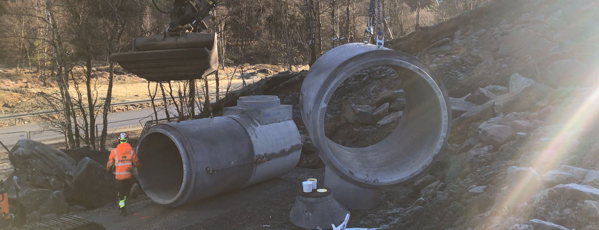 NOBI har blant annet levert armerte falsrør til prosjektet. Rørene har benevningen «igT» som følge av at de har innstøpt gummipakning og samtidig er tetthetskontrollert. Hensikten bak den innstøpte gummipakningen er at rørene bedre låses sammen. For å garantere tetthet i skjøtene er det i tillegg brukt et spesialtilpasset glidemiddel fra vår pakningsleverandør. På vår fabrikk like utenfor Bergen testes enkelte rør med et innvendig vanntrykk- og består dermed krav til tetthet for både innvendig og utvendig trykk.