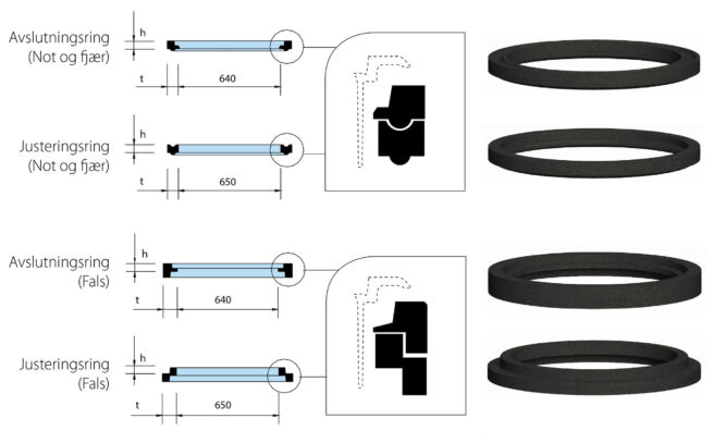 Avslutningsringen sikrer jevn lastoverføring fra kumramme i anleggsperioden før asfaltering og sikrer mot skade av justeringsring/kjegletopp. Avslutningsringen er funksjonell både i anleggsperioden og ved permanent drift. NOBI tilbyr avslutningsring med fals, samt justeringsring med not og fjær.