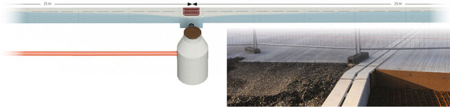 Vannføringskapasiteten for 25 meter slisserenne som avsluttes med et utløpselement er ca 35 liter/sek (når rennen ligger u/ fall).