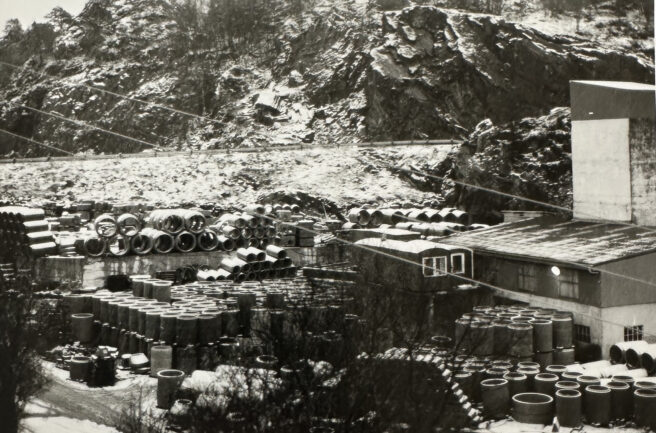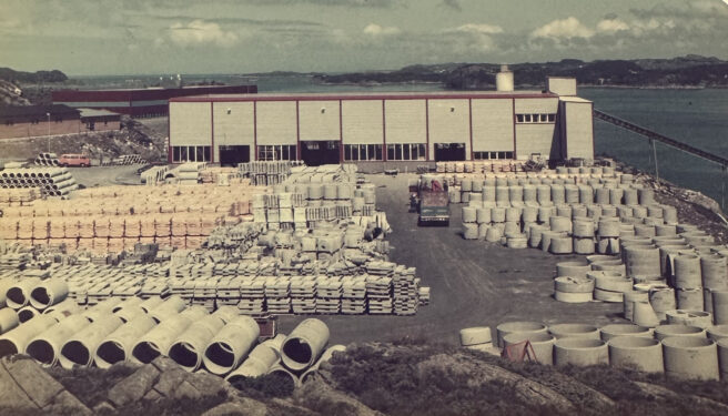 På gamlefabrikken til NOBI (ca. 1980), hvor bedriften for lengst hadde gått bort fra tilvirkning av tømmer og tresko. På Haugland Cementindustri ble rør og kummer raskt en stor suksess og førte til store plassproblemer.