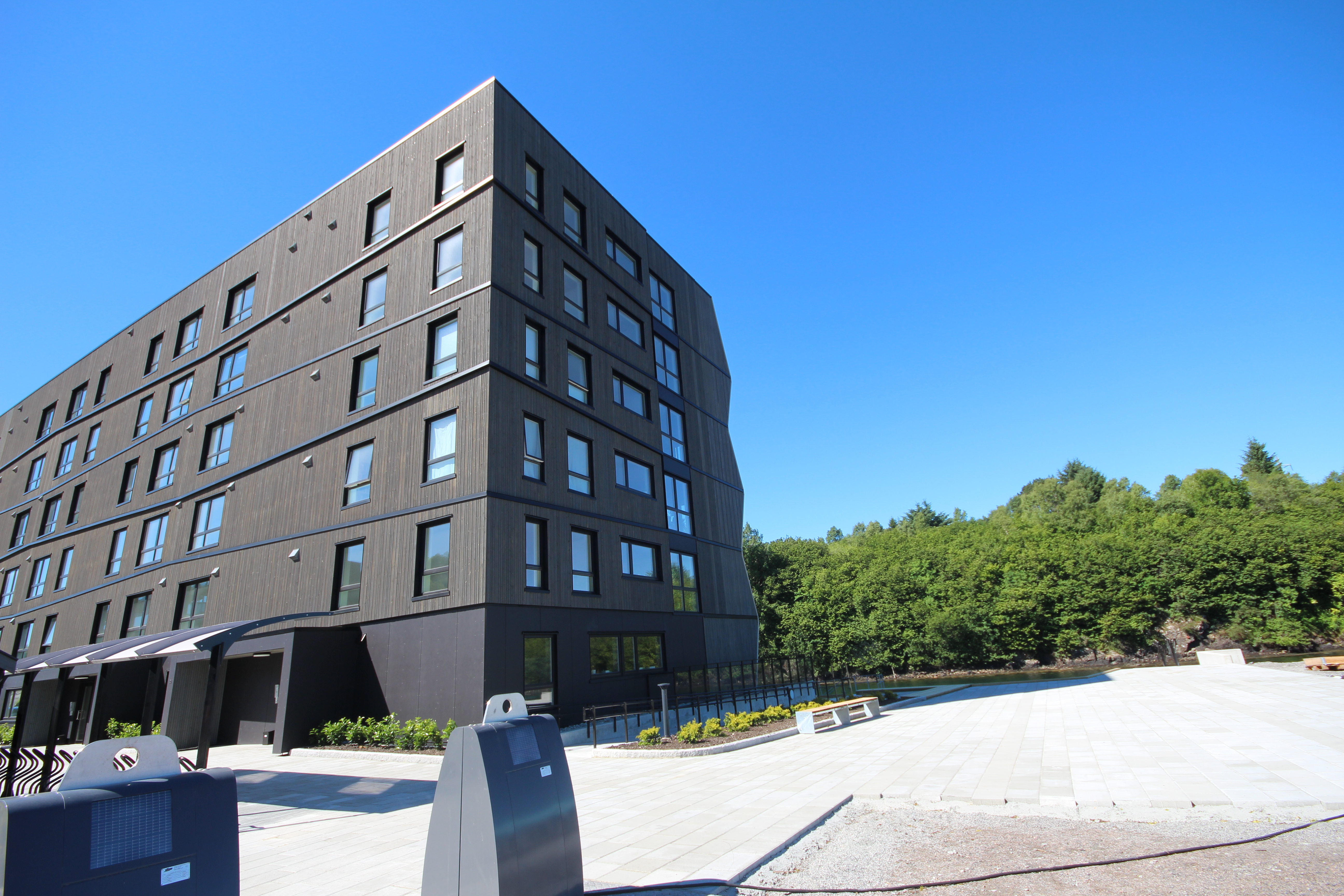 36 leiligheter er plassert i et bygg som ligger direkte i vannkanten. Her har NOBI Voss levert balkonger, takelementer (over balkonger), trapper og repos.