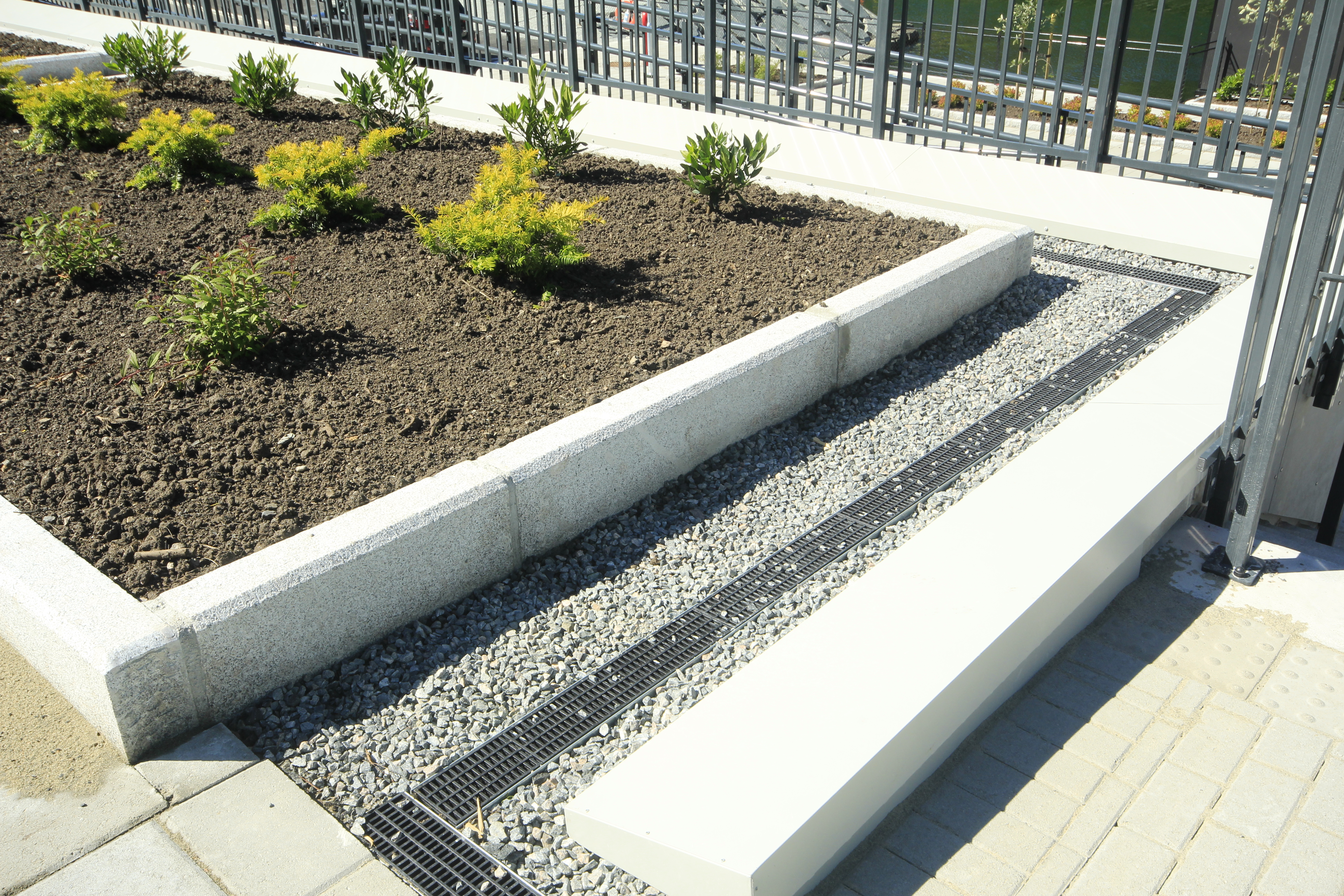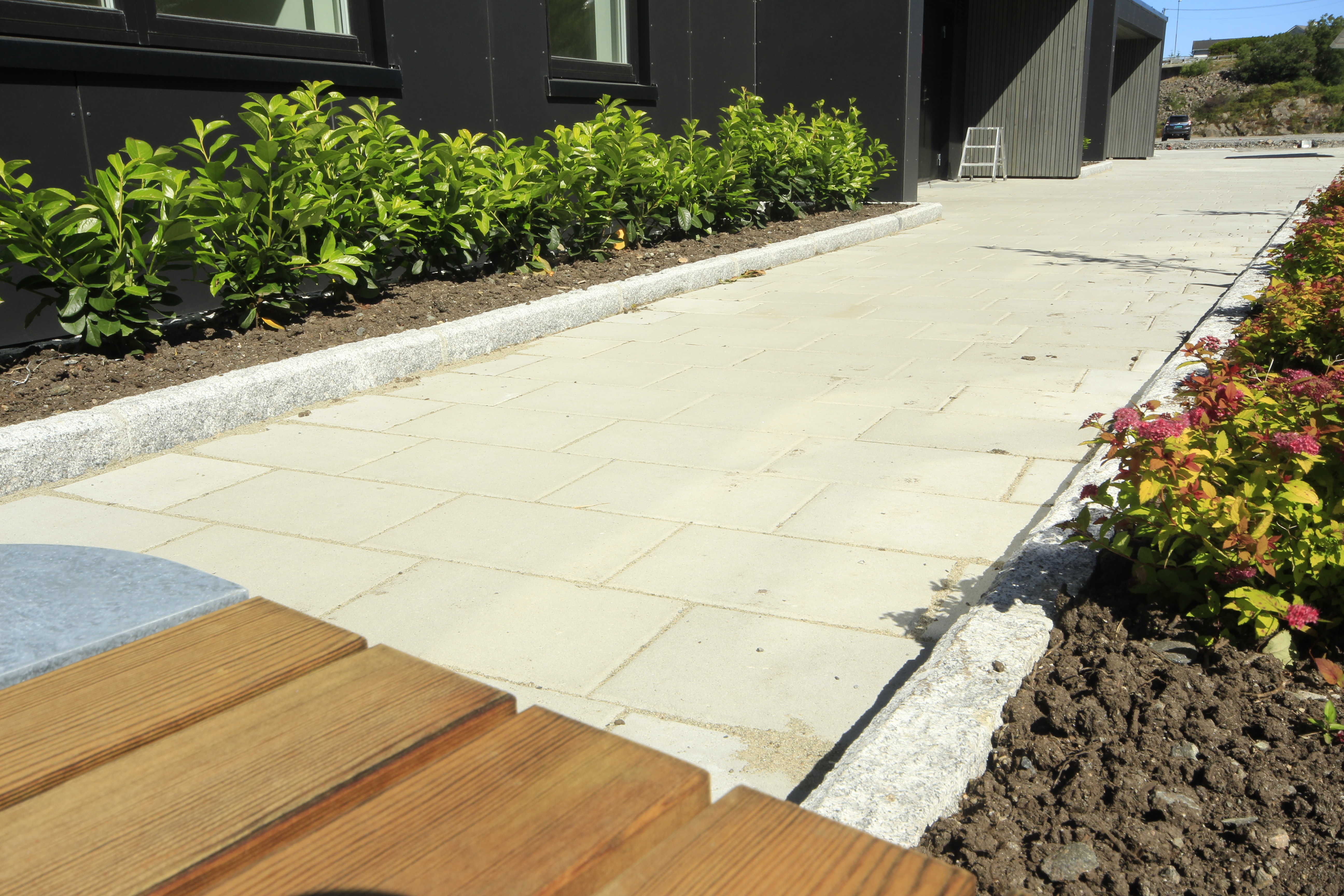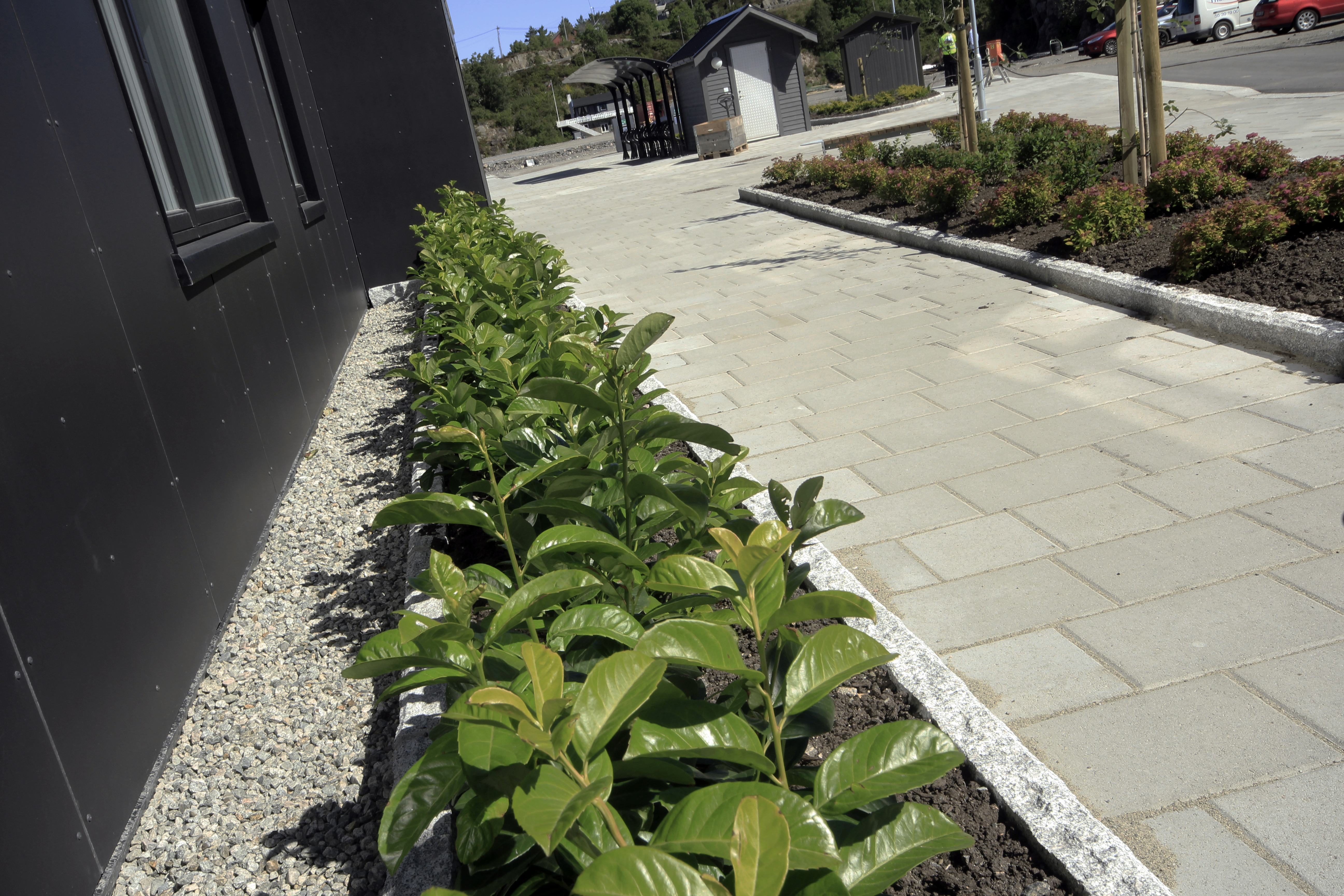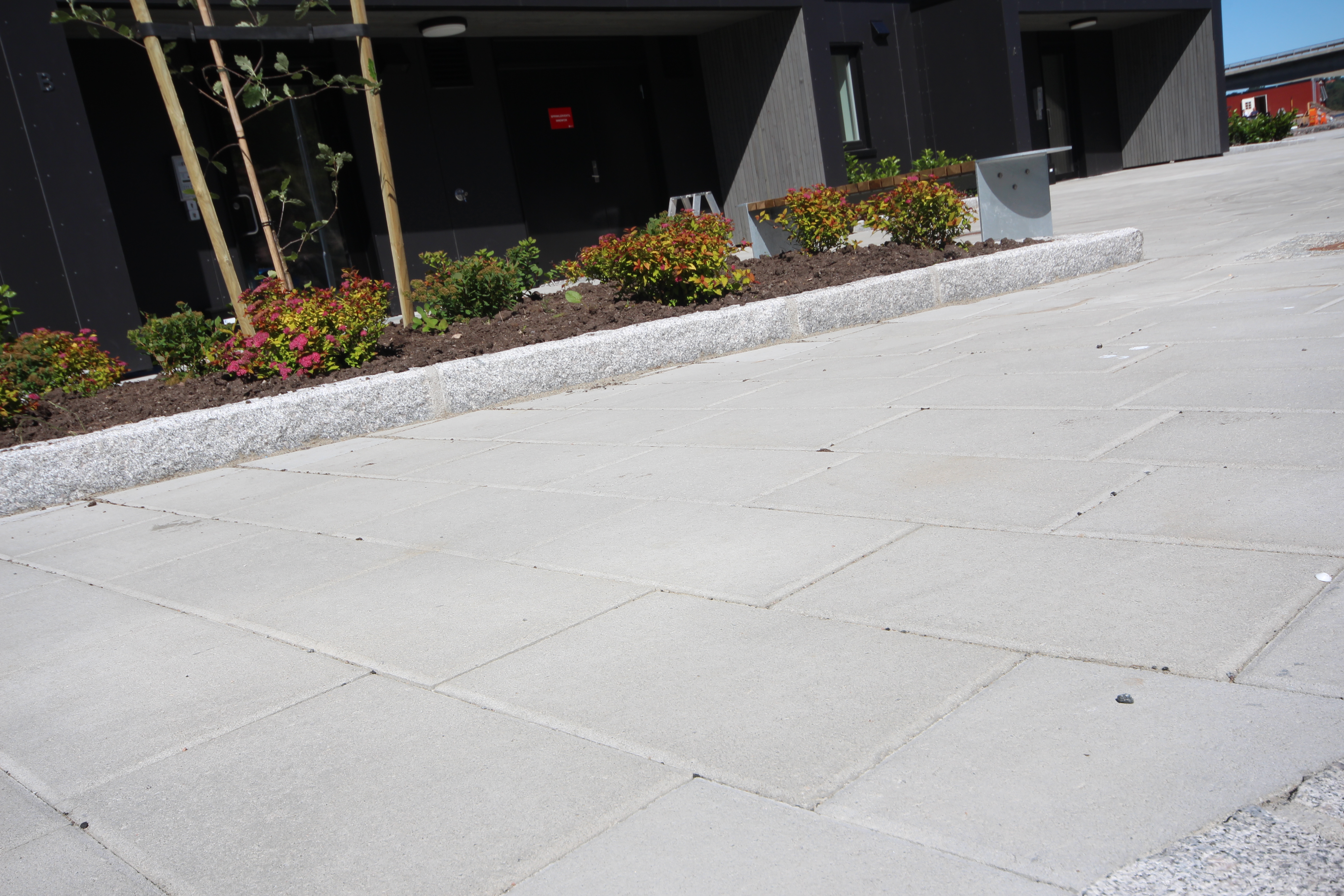 – Jeg mener det er viktig å bruke lokale leverandører, og synes dekket har blitt kjempefint! Betonghellene gir liv og spill, sier Nina Eileen Askeland, daglig leder i Anleggsgartnermester Askeland a.s. De har gjort alt utomhusarbeidet.