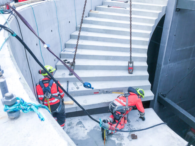 Når NOBI ankom anleggsområdet, var siste leveransen godt på vei. Både kran og montasjelag fra Veidekke ventet spent på siste lass. For D13-prosjektet vil monteringen av det gjenstående elementet markere et komplett, fullført trappeløp for den nye inngangen.