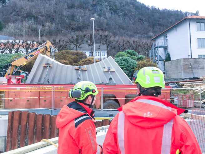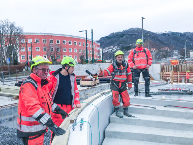 På D13 Haukeland holdeplass har prosjektet hatt tydelig visuell fremdrift de siste månedene. NOBI var til stede under et av prosjektets største milepæler, selve montasjen av gjenstående trappeløp rundt heissjakten.